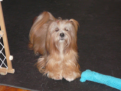 Myth went next. I had no goals, at the very least I though we would hang out in the middle of the ring and Myth would get treats…..SURPRISE, she was all for it, with speed, one little moment of trepidation when she went up the teeter – it was close to a wall where there were several rolls of black matting stacked – scary Lhasa eating rolls, but she still did a really nice teeter and did it several more times. Her weaves were not so great but we did those later after she was a little tired.